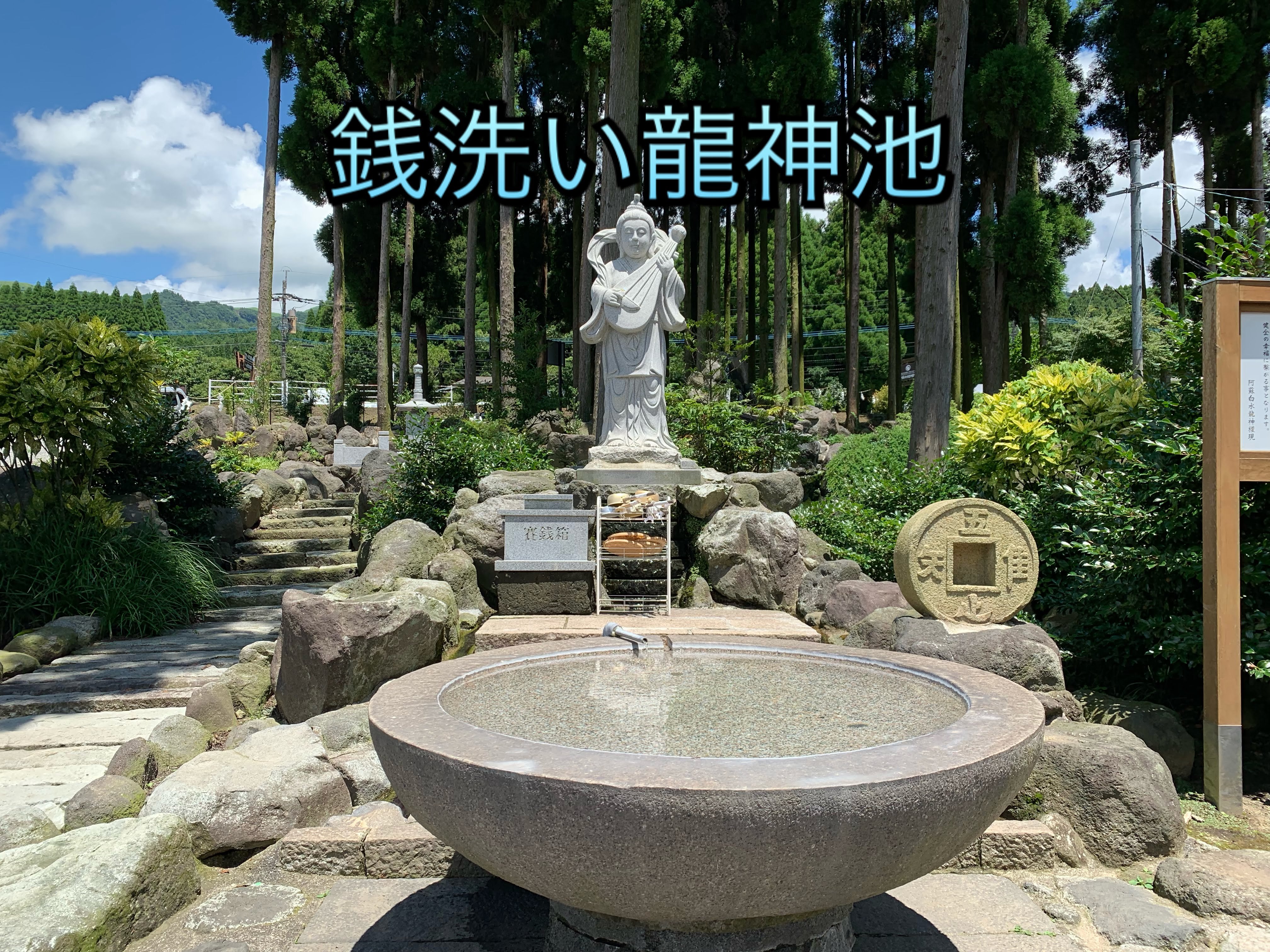人々に富をもたらしてくれるお金も、世間で使われている間に様々な方の思いを請けて、穢れを持ってしまいます。弁財天前にある水盤の水でお金(お札、小銭)を洗い清めてから使うと、より多くの利益をもたらしてくれます。洗ったお札を傍らにある五円玉石塔にこすり付けて乾かしますと、お札に御縁を頂き、銭廻りが良くなると言われています。